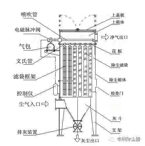 除塵器由灰斗、上箱體、中箱體、下箱體等部分組成,上、中、下箱體為分室結構。工作時, 含塵氣體由進風道進入灰斗,粗塵粒直接落入灰斗底部,細塵粒隨氣流轉折向上進入中、下 箱體,粉塵積附在濾袋外表面,過濾后的氣體進入上箱體至凈氣集合管-排風道,經排風機 排至大氣。 清灰過程是先切斷該室的凈氣出口風道, 使該室的布袋處于無氣流通過的狀態。 然后開啟脈 沖閥用壓縮空氣進行脈沖噴吹清灰, 切斷閥關閉時間足以保證在噴吹后從濾袋上剝離的粉塵 沉降至灰斗, 避免了粉塵在脫離濾袋表面后又隨氣流附集到相鄰濾袋表面的現象, 使濾袋清 灰徹底,并由可編程序控制儀對排氣閥、脈沖閥及卸灰閥等進行全自動控制。