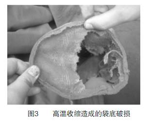 高溫煙氣對濾袋的另外一種損害是高溫收縮,雖然每種濾料的使用溫度不同,但當煙氣溫度超過其使用溫度后,如其經向收縮率過大,會使濾袋在長度方向上尺寸變短,濾袋袋底緊托著骨架并受力而損壞(如圖3)。如果濾袋緯向熱收縮過大,將使濾袋在徑向尺寸變小,濾袋會緊緊箍在骨架上,甚至無法抽出骨架。從而使濾袋一直處于受力狀態,造成濾袋的收縮變形、變硬、變脆,加快強度耗損、減短濾袋壽命。由于濾袋變形后會緊緊箍在骨架上,在清灰時濾袋難以變形而不利于噴吹清灰,導致濾袋阻力居高不下。