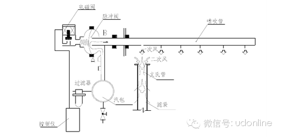 噴吹系統(tǒng)及其工作原理如圖2所示。脈沖閥A端接壓縮空氣包,B端接噴吹管,脈沖閥背壓室接埪制閥,控制儀控制著埪制閥和脈沖閥開啟。當(dāng)控制儀無信號(hào)輸出時(shí),控制閥的排氣被關(guān)閉,脈沖閥噴吹口處與關(guān)閉狀態(tài),當(dāng)控制儀發(fā)出信號(hào)時(shí)控制閥排氣口被打開,脈沖閥背壓室的氣體泄掉,壓力降低,膜片兩面產(chǎn)生壓差,膜片因壓差作用而產(chǎn)生位移,脈沖閥噴吹打開,此時(shí)壓縮空氣從氣包通過脈沖閥經(jīng)噴吹管小孔噴至文氏管進(jìn)入濾袋(從噴吹管噴出的氣體為一次風(fēng))。當(dāng)高速氣體流通過文氏管過程誘導(dǎo)了數(shù)倍于一次風(fēng)的周為空氣(稱為二次風(fēng)),造成濾袋內(nèi)瞬時(shí)正壓,實(shí)現(xiàn)清灰。