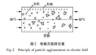 電聚并是各聚并技術中好實用有效的方法。電聚并是通過細顆粒荷電,促使細顆粒相互吸引、碰撞、聚并,使細顆粒團聚成大顆粒。電聚并的效果取決于粒子的濃度、粒徑、電荷的分布以及外電場的強弱(圖2)。