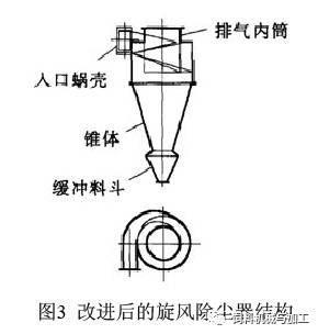 這種新型旋風(fēng)除塵器在結(jié)構(gòu)相主要改進(jìn)如下:①進(jìn)口管下斜5o-10o,使氣流在旋轉(zhuǎn)的同時(shí)保證了向下的旋轉(zhuǎn)。并且下傾角確保了塵粒反彈時(shí)絕對折射朝下。向下旋轉(zhuǎn),引起除塵器頂部倒空形成上渦旋氣流產(chǎn)生頂部灰環(huán),灰環(huán)沿著排氣管道外表面旋轉(zhuǎn)向下時(shí),會在排風(fēng)管入口處與已凈化廢氣的上旋氣流混合,而后經(jīng)排風(fēng)管排出除塵器。②進(jìn)口管采用180o的半圈螺進(jìn)筒后才旋轉(zhuǎn),而改進(jìn)型則是確保塵氣調(diào)整旋轉(zhuǎn)起來后才進(jìn)筒。③進(jìn)口螺旋道截面遞減,增大了氣流旋轉(zhuǎn)起來后離心力。含粉塵的氣體在螺旋道中實(shí)現(xiàn)1.4倍加速。提高了塵粒的慣性,降低了塵粒沉降的時(shí)間。④錐體長度加長并采用200小錐角,增加了氣流在分離器中的停留時(shí)間,有利于小顆粒的沉降完全,且使向下旋轉(zhuǎn)的氣體平緩地轉(zhuǎn)變成折轉(zhuǎn)向上的旋轉(zhuǎn),從而使除塵效率得以提高。⑤除塵器下設(shè)緩沖料斗,有效改善廢氣在筒體內(nèi)的流動(dòng)工況,減少了灰斗的反混現(xiàn)象和下灰環(huán)可能產(chǎn)生的二次揚(yáng)塵。⑥出風(fēng)管增長,直到螺旋軌道的底部,防止了內(nèi)側(cè)部分塵粒裹進(jìn)出風(fēng)管。⑦進(jìn)口、加速段、出口的截面積之比擴(kuò)大為1:0.7:2,即出口網(wǎng)速是進(jìn)口速度的一半;出口風(fēng)速是內(nèi)部加速段的1/3。改進(jìn)型除塵器粒子的離心力比在傳統(tǒng)型除塵器中的離心力增大了1.4倍以上。而出口處,負(fù)壓對粒子的吸力比傳統(tǒng)型約小了1/4。因此,氣流進(jìn)筒后,塵粒因慣性大,使得稍小些的顆粒在氣流在旋風(fēng)除塵器中停留時(shí)間內(nèi)也能得到分離。出風(fēng)網(wǎng)速降低,也使得部分細(xì)小的顆粒能擺脫上升氣流的吸力而有機(jī)會沉降下來,從而使其分享。