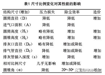 旋風(fēng)除塵器的各個(gè)部件都有一定的尺寸比例,每一個(gè)比例關(guān)系的變動(dòng),都能影響旋風(fēng)除塵器的效率和壓力損失。其中除塵器直徑、進(jìn)氣口尺寸、排氣管直徑為主要影響因素。它們的變化對除塵器性能的影響關(guān)系見表1。在使用時(shí)應(yīng)注意,表1中所示的尺寸只能在一定范圍內(nèi)進(jìn)行調(diào)整,當(dāng)超過某一界限時(shí),有利因素也能轉(zhuǎn)化為不利因素。另外,有的因素對于提高除塵效率有利,但卻會增加壓力損失,因而對因素的調(diào)整必須兼顧。
